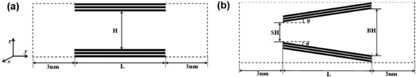 狹縫孔由半有限狹縫孔由兩個(gè)平行的石墨壁組成。每個(gè)壁包含三個(gè)石墨烯層,如圖1(a)所示?虻奶摼表示模擬框在y和z方向上的邊界。周期性邊界條件僅適用于x方向。兩個(gè)開口端與大塊氣藏相連,每個(gè)氣藏沿y軸的長(zhǎng)度為3nm,孔隙寬度決定了z方向的尺寸。因此,通過(guò)孔內(nèi)分子與體相的相互作用,可以在孔和周圍環(huán)境之間保持機(jī)械平衡。孔徑H是指通過(guò)一個(gè)壁最內(nèi)層中碳原子中心的平面與相對(duì)壁的相應(yīng)平面之間的距離。楔形孔在圖1(b)描繪了一個(gè)開放的楔形孔及其結(jié)構(gòu)參數(shù):小端(SH)和大端(BH)的孔徑,軸向孔長(zhǎng)(L)和半角(α)?虻奶摼表示模擬框在y和z方向上的邊界。與狹縫孔一樣,開口端周圍的氣體沿y軸的長(zhǎng)度為3nm,大端的寬度決定了z方向的尺寸。沿軸向(即,y方向)的孔長(zhǎng)度是有限的L,而在x方向上的尺寸在應(yīng)用周期性邊界條件的情況下假定為無(wú)限。