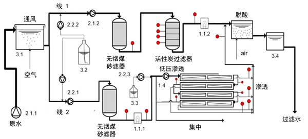 半技術(shù)試驗(yàn)工廠安裝了電氣安裝,工廠控制和數(shù)據(jù)管理。中試工廠由兩條處理線活性炭和反滲透膜(參見圖1)組成,具有17個(gè)采樣點(diǎn)。充氣后的原水通過增壓泵2.1.1和2.1.2從儲(chǔ)水箱(3.1)連續(xù)泵出。將痕量有機(jī)污染物(3.2)注入標(biāo)有2.2.1和2.2.2的泵的吸入側(cè),以確保適當(dāng)?shù)臎_洗混合和良好的分散性。加水后的水以平行模式通過無(wú)煙煤砂濾池以及隨后的活性炭(線1)和反滲透膜(線2)。每月對(duì)粒子過濾器進(jìn)行反沖洗。為了測(cè)試紫外線消毒在反滲透膜之前作為減少生物結(jié)垢的附加預(yù)處理步驟的效果,在活性炭砂濾池的下游操作了紫外線裝置(1.1.1)。反滲透膜管線的進(jìn)料通過兩個(gè)濾筒過濾器進(jìn)行預(yù)處理,兩個(gè)濾筒過濾器依次安裝了80和5μm的標(biāo)稱截止值。